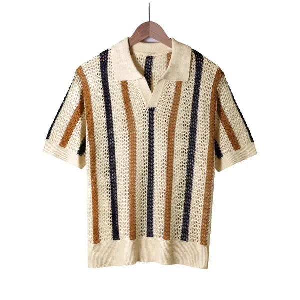 Amalfi Crochet Knit Polo - Sand/Navy Stripe