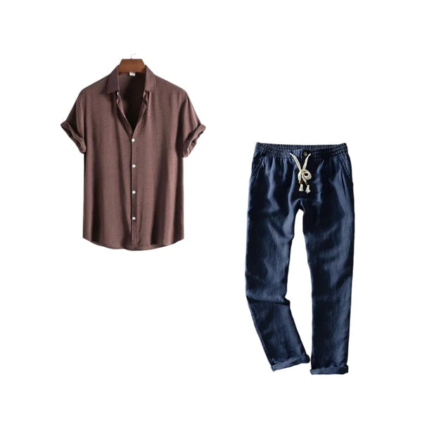 The Harbor Linen Contrast Set delivers a clean, elevated look built for warm weather and effortless everyday wear. The shirt is made from smooth, breathable cotton for lightweight comfort, while the pants are crafted from 100% high-quality linen for an airy feel and a refined natural texture. Together, they create a sharp, minimal outfit that works for travel, weekends, and smart-casual occasions.